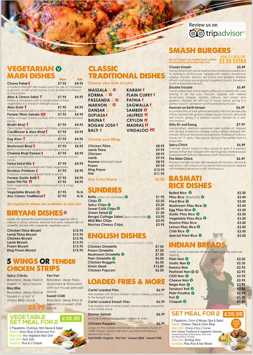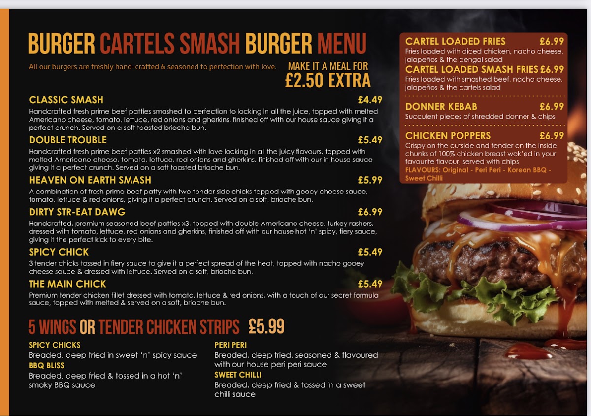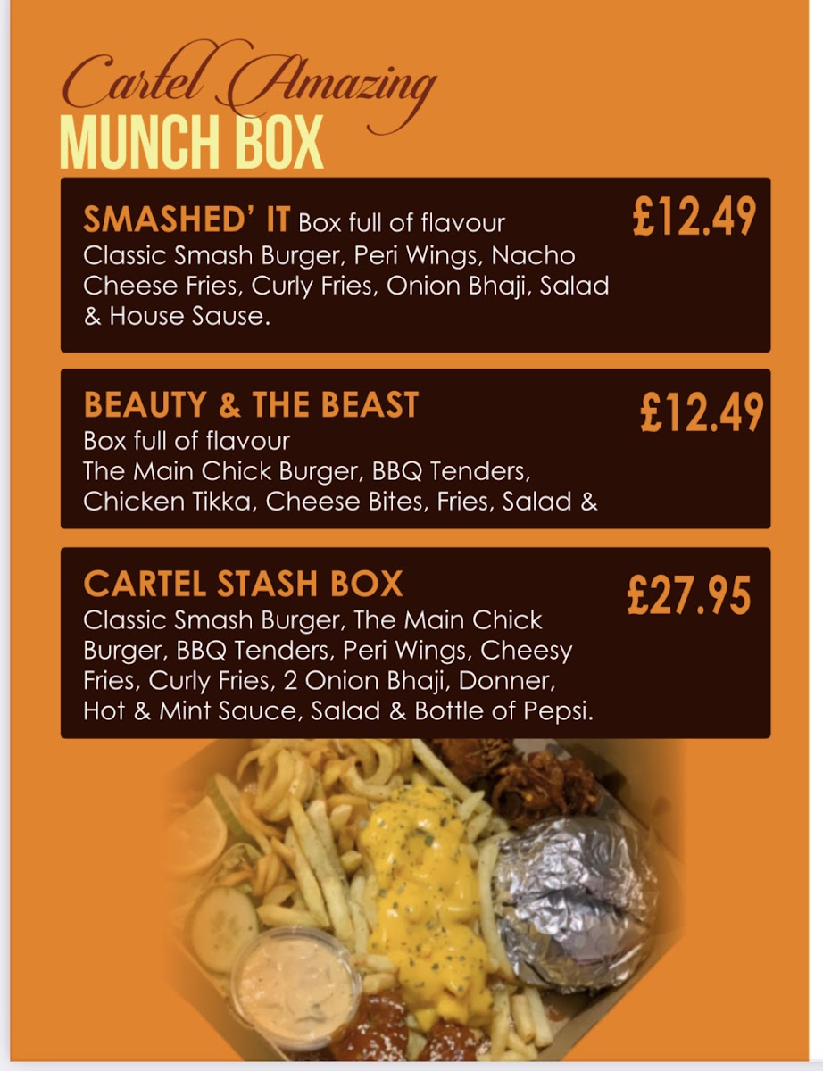 For a bit of variety, the Smash Burgers menu offers exciting options such as the Classic Smash, Double Trouble, and the indulgent Heaven On Earth Smash. Also, don't miss the Cartel Amazing Munch Box for a fun, shareable experience.
