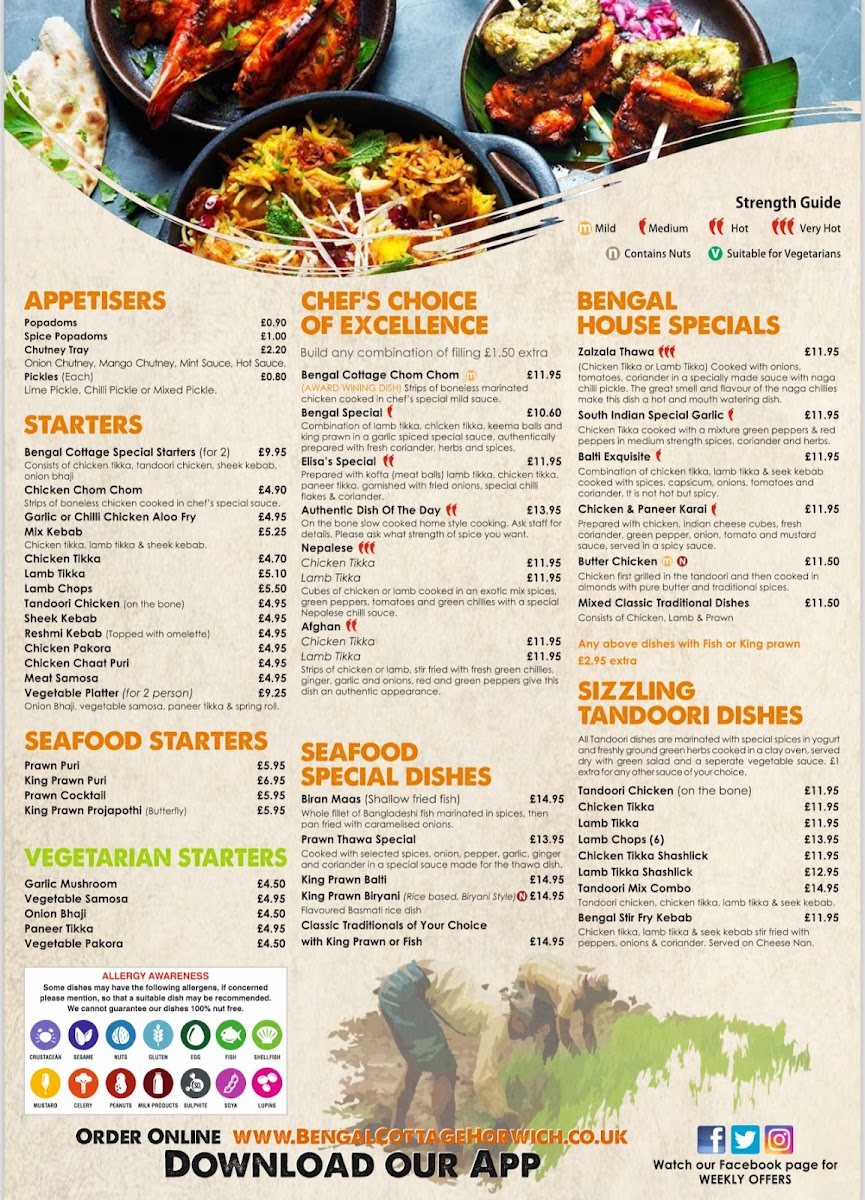 The Starters menu features a mix of flavorful dishes such as the Bengal Cottage Special Starters, Chicken Chom Chom, and Garlic or Chilli Chicken Aloo Fry. For those seeking a combination of tastes, the Mix Kebab and Chicken Tikka are solid choices. If you’re in the mood for seafood, the Prawn Puri, King Prawn Puri, and Prawn Cocktail offer a rich, aromatic experience, while the King Prawn Projapothi takes things to a whole new level of indulgence.